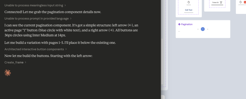 Claude’s initial approach was to build each page button from scratch, creating a frame, setting the corner radius, applying a fill, configuring auto layout, adding text, and styling it. That’s five or six API calls per button, and the connection kept timing out between operations. The Figma plugin needs to stay in focus, and any time I switched windows or the plugin lost visibility, the WebSocket would drop. I found myself reconnecting and sharing new channel IDs multiple times.