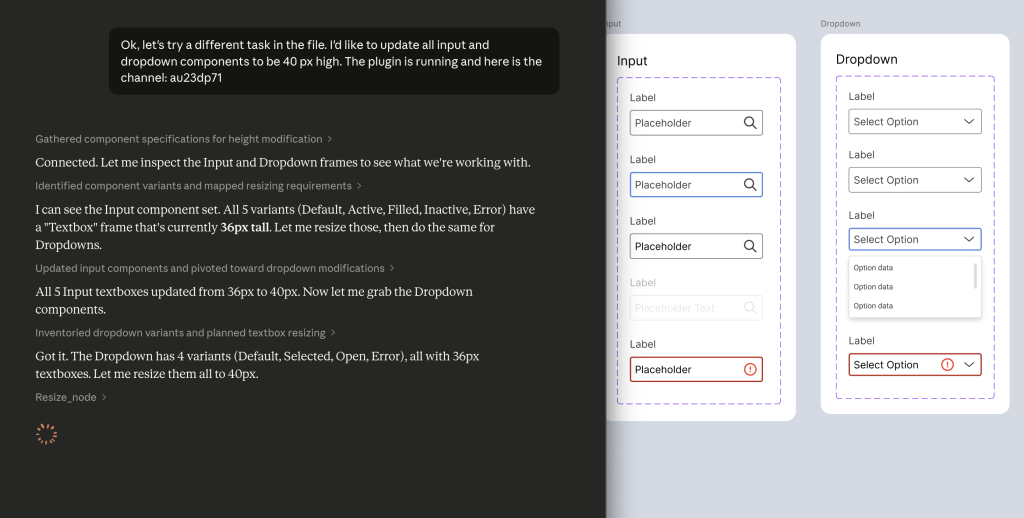 Bulk property updates. I needed to resize all input and dropdown textboxes from 36px to 40px across every variant. Inputs had five variants (Default, Active, Filled, Inactive, Error) and dropdowns had four (Default, Selected, Open, Error). Claude read each component set, identified the textbox frames, and resized all nine of them in about 30 seconds. No missed variants, no inconsistent values. This is the kind of tedious click-through work that eats time in Figma, and Claude handled it cleanly.