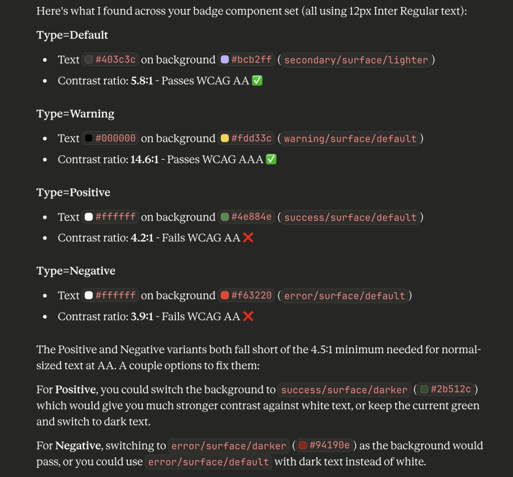 Accessibility auditing. This was the real surprise. I asked Claude to check the contrast ratios on my badge component. It read the text colors and background fills from all four variants (Default, Warning, Positive, Negative), calculated the WCAG contrast ratios, and identified two failures. The Positive badge (white text on success/surface/default at #4e884e) came in at 4.2:1, and the Negative badge (white text on error/surface/default at #f63220) was 3.9:1. Both below the 4.5:1 AA threshold.