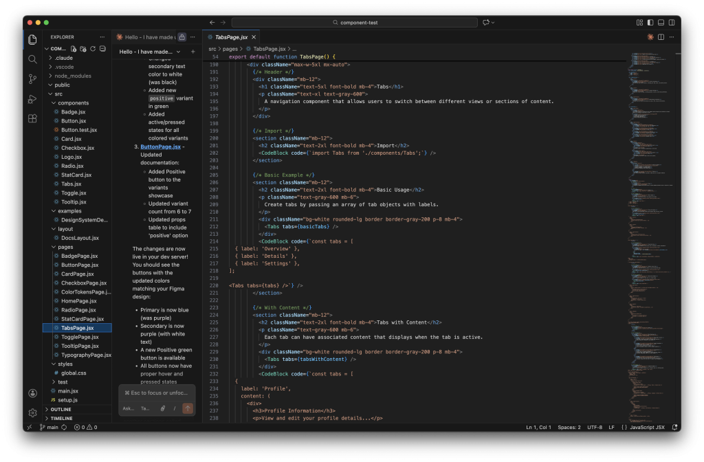 This is where things got interesting. Using Claude in VS Code, I translated each Figma component into React with Tailwind CSS. The AI handled a lot of the repetitive work: generating component boilerplate, writing props tables, creating usage examples, and drafting best practice guidelines.