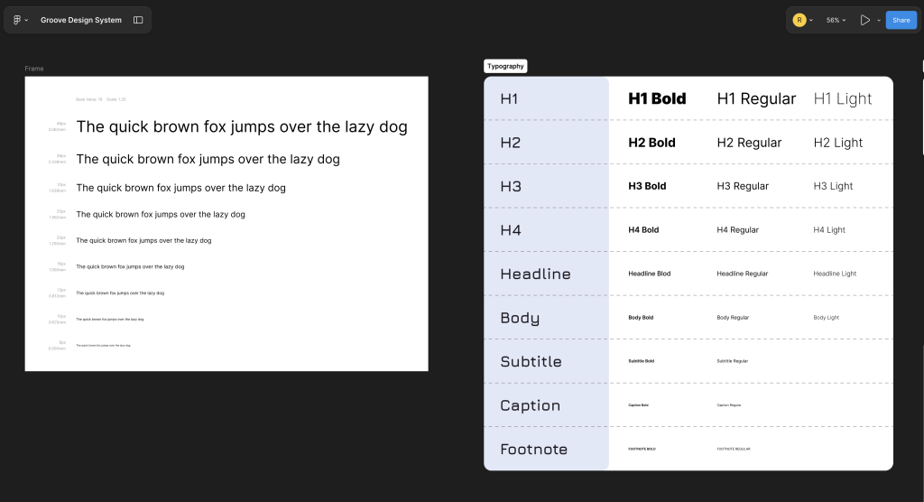 For typography, I defined a scale that covers headings, body text, and supporting styles. These decisions inform how every component handles text, from button labels to card descriptions.